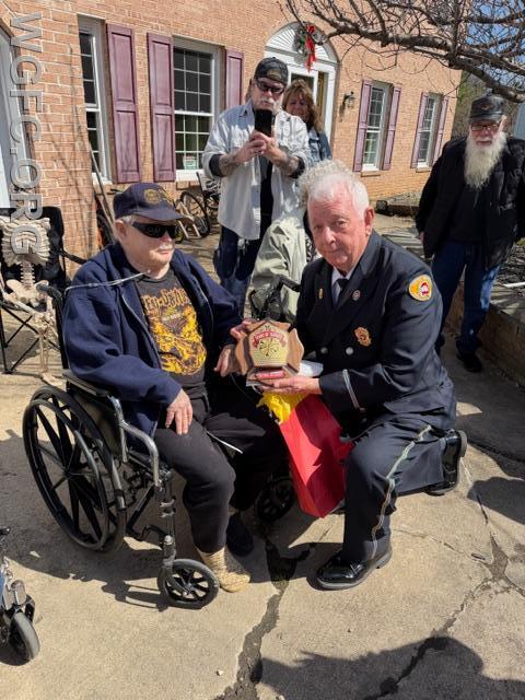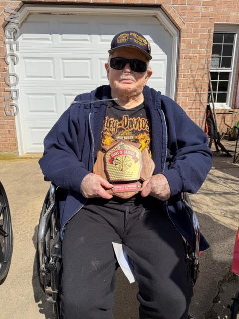 WGFC firefighters honor Past Chief W. Forrest Hammond on his 90th birthday and present him with a plaque commemorating 75 years of service.