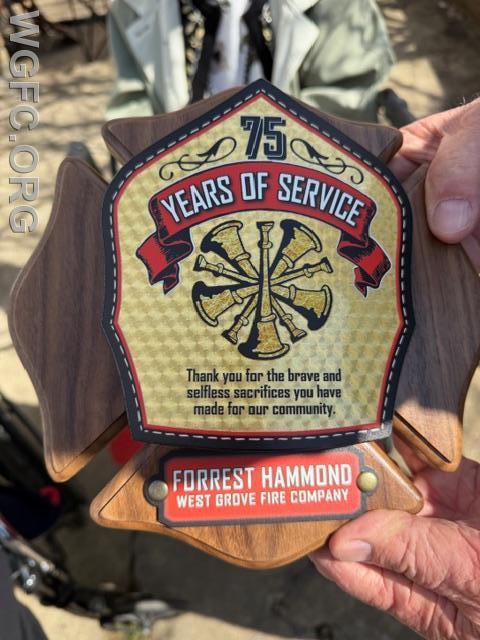 In front of family and friends, Past President Bill "Radar" O'Connell presented Chief Hammond with a plaque celebrating 75 years of volunteer service to the West Grove Fire Company with members greeting Chief Hammond and wishing him Happy Birthday.